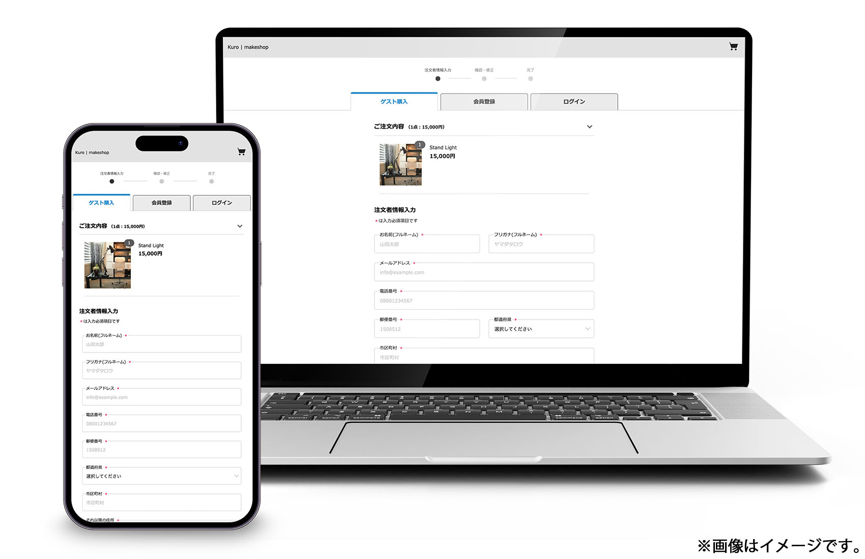ゲスト購入であっても最初に注文者情報のみご入力いただき、次の画面で全ての情報をご選択いただく流れとなるのでスムーズなお買い物が可能になります。