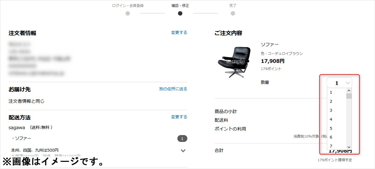 決済画面内でカートに入れた商品の数量を変更することができます。
